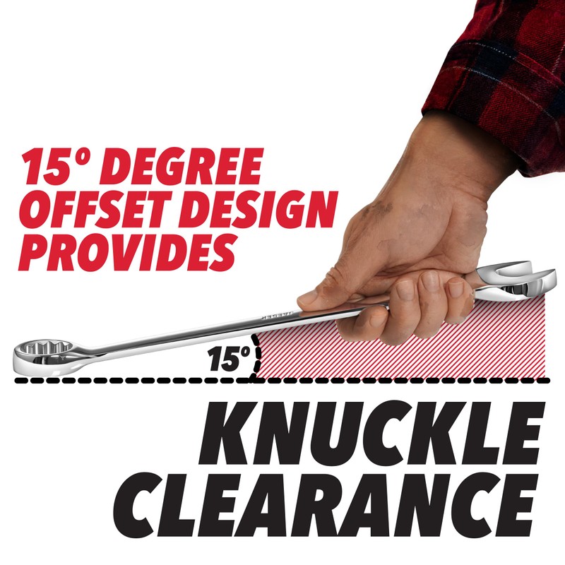 - 15 Degree Offset Box End: Work easier in tight spaces with our 15° Offset Box End. Less busted knuckles, and cleaner fastener work.