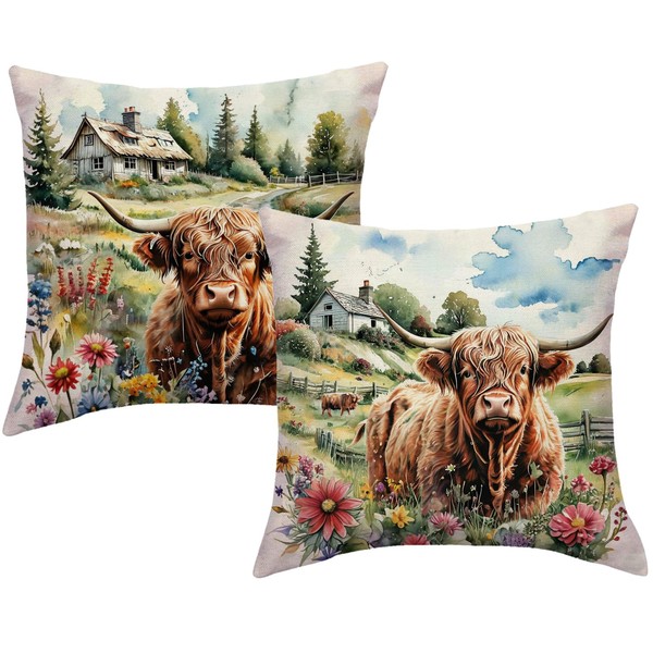 JAERUE Highland Cow Decorative Throw Pillow Covers with Wildflowers 18x18 Inch Farmhouse Rustic Cushion Cover Western Cows Pillowcase 2Pack for Couch Sofa (Green)