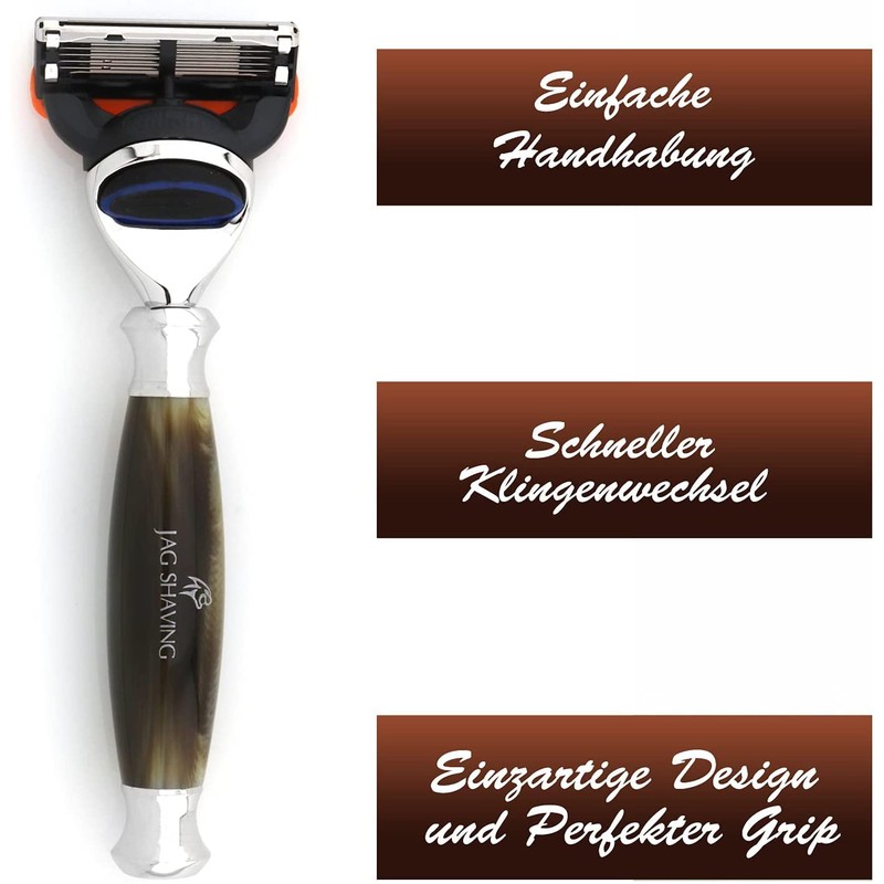 - 5-blade safety razor: Jag Shaving introduces safety razors for men and women. This is a sustainable safety razor made of stainless steel and wood. Elegant and unique design.