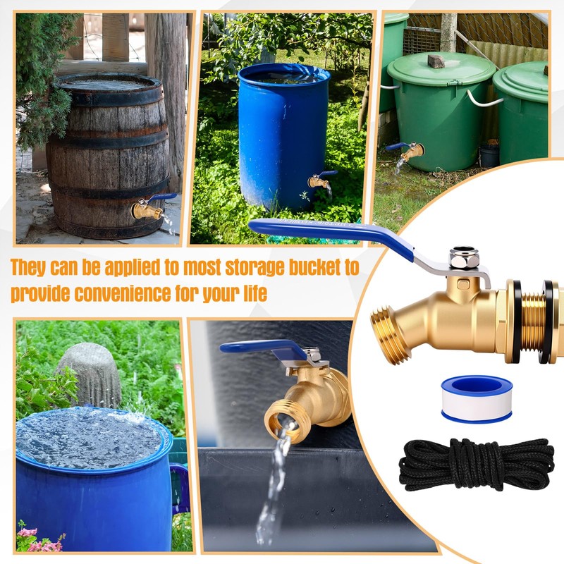 - Rain Barrel Spigot Kit: this set includes 1 brass rain bucket faucet, 1 bulkhead fitting, 1 tape, 2 rubber washers, and 1 traction rope; The convenient combination ensures you can quickly and easily access the water collected in your rain barrel