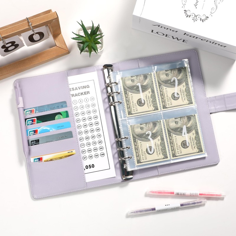 - Premium-Quality Materials: Crafted from thick and durable PU leather, the 100 day challenge money saving binder in this set is designed to withstand the test of time and resist scratches. It features 6 stainless steel rings that allow you to effortlessly flip through the pages. The transparent PVC cash envelopes are waterproof and tear-resistant, ensuring that they hold up throughout your entire savings challenge.