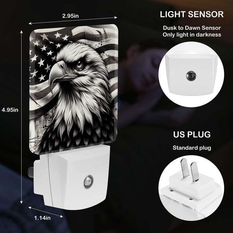 Jahiona LED Night Light Lamp with Smart Sensor Dusk to Dawn Sensor,Creepy Bald Eagle Tattered American Flag Behind Night Light Daylight White,0.5W Plug-into Wall for Adults,Bedroom,Bathroom,Hallway