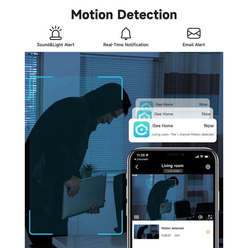 - Motion Detection and Real-Time Alerts: Be aware of all the people's activities in your room even when you're not there! When a person is detected, this indoor security camera will record a video and send real-time alerts directly to your phone. In addition, the house camera can trigger sound and light alarms to drive away unwanted people. You can also customize the detection zones to focus on the areas that are most important to you.