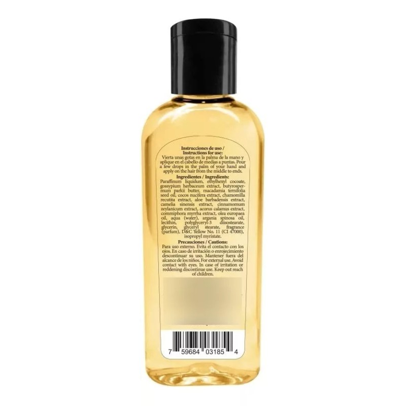 MODO DE EMPLEO: Vierta unas gotas en la palma de la mano y aplique en el cabello de medias a puntas.