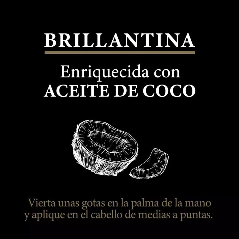 ACEITE BRILLANTINA: Enriquecido con Aceite de Coco. Suaviza e hidrata, Anti Frizz, da brillo al cabello.