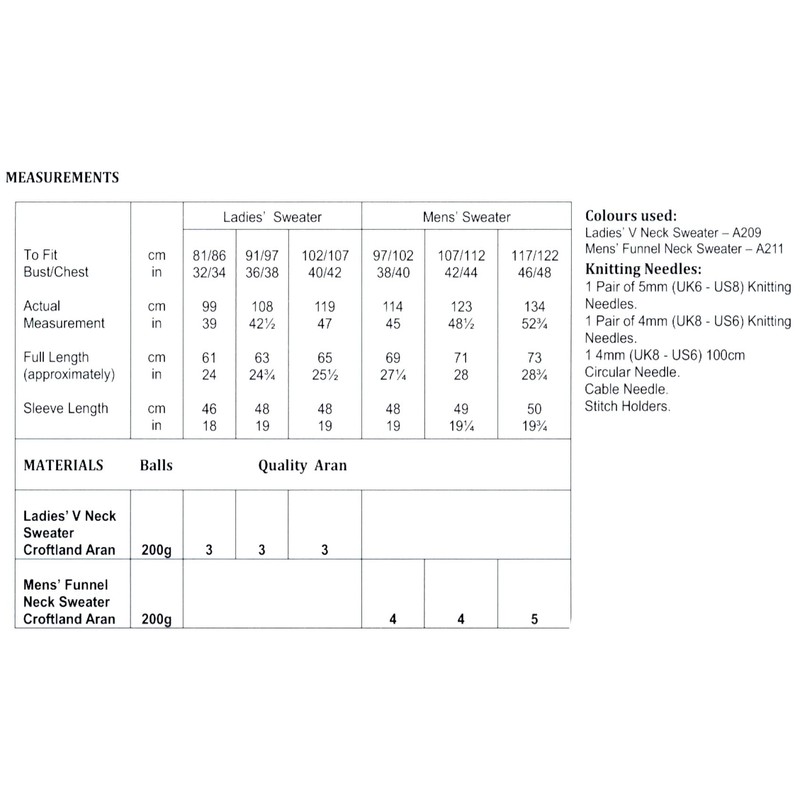 - The yarn requirements for the garments in this leaflet are as follows: Womens V Neck Sweater to fit bust 32" / 34" [36" / 38": 40" / 42"] use James C Brett Croftland Aran 100g - Shade A209 3 [3: 3] balls. Mens Sweater to fit chest 38" / 40" [42" / 44": 46" / 48"] use James C Brett Croftland Aran 100g - Shade A211 4 [4: 5] balls.