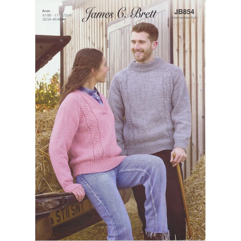 James Brett Aran Knitting Pattern Ladies V Neck & Mens Funnel Neck Sweater (JB854)