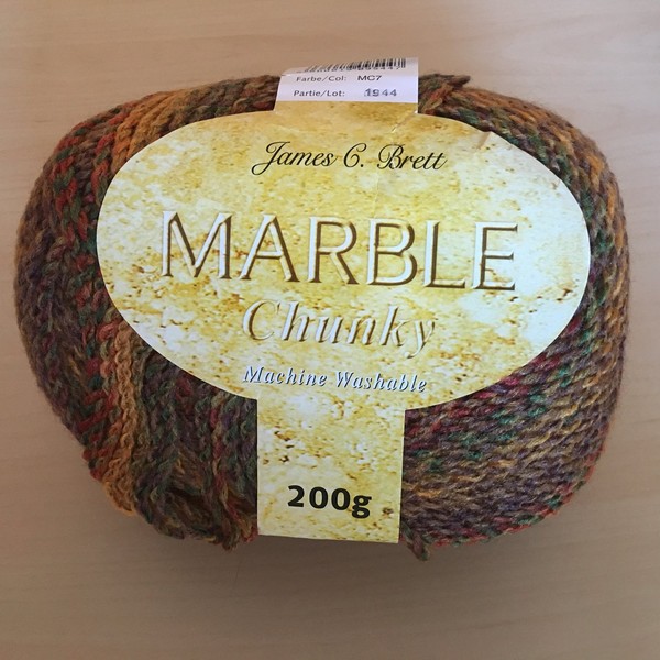 James C. Brett Marble Chunky James C Brett Marble Chunky offers top quality and machine wash practicality combined with a beautiful softness of handle . This yarn is available in a range of wonderful bright, but calming marbled shades WEIGHT 200g LENGTH 312m/341yds NEEDLE SIZE 6mm TENSION 14sts+20rows per 10cm/4inch COMPOSITION 100% Premium Acrylic