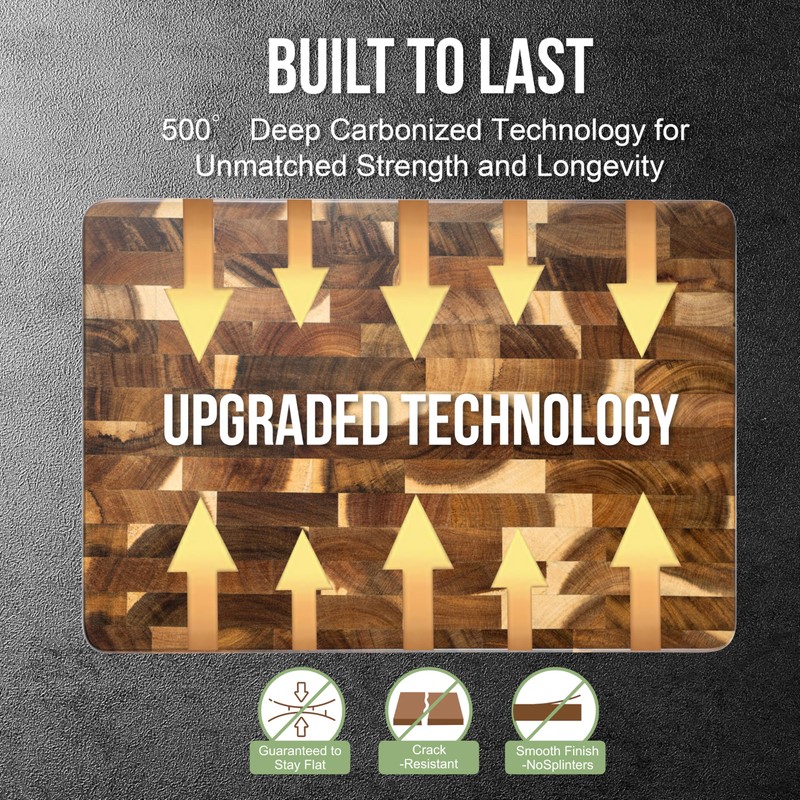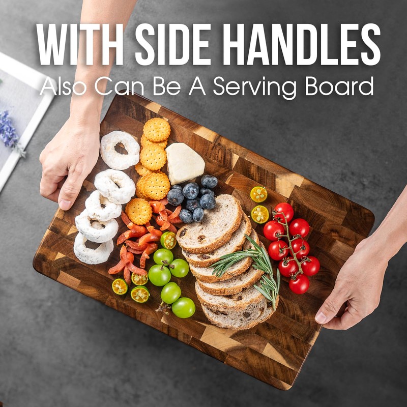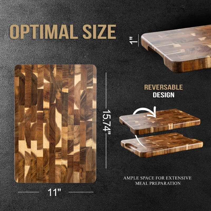 • LARGE & THICK CUTTING BOARD–The cutting board measures 15.74"x11"x1". It"s big, thick, sturdy with end grain wood. Could be used as cutting, chopping, carving board, heavy duty butcher block or serving tray. With proper care, this cutting board will outlast most items in your kitchen.