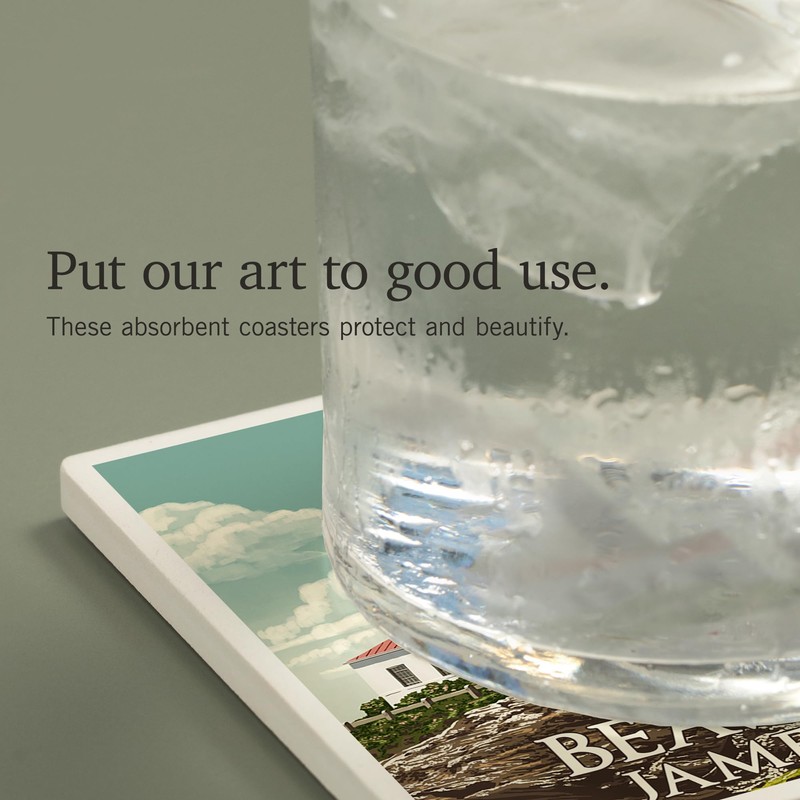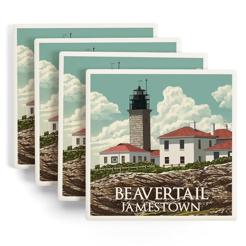 - Jamestown, Rhode Island, Letterpress, Beavertail Lighthouse (Absorbent Ceramic Coasters Set of 4 Matching Images, Cork Back, Kitchen Table Decor)