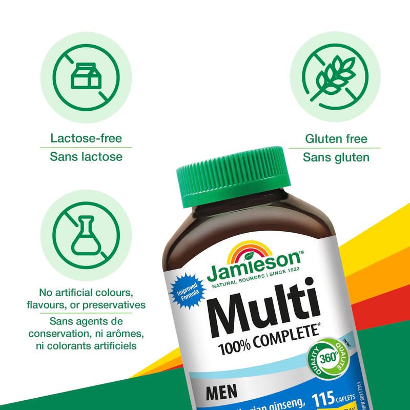 Jamieson 100% Complete Multivitamin for Men is the easy way to get 100% of your body's daily vitamin needs. It is formulated so you can feel confident you are getting 100% or more of the vitamins your body needs each day!