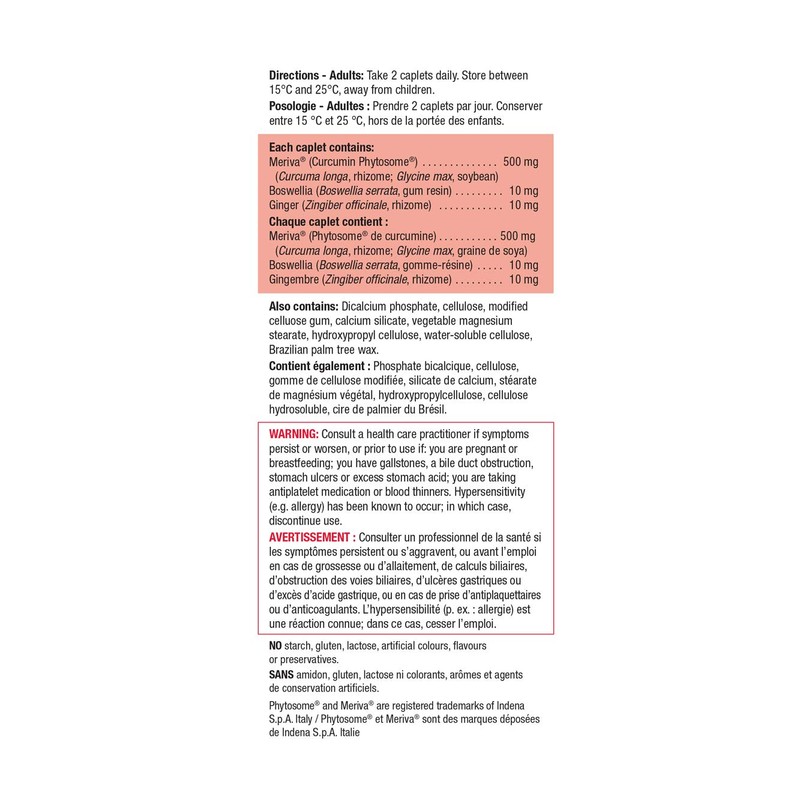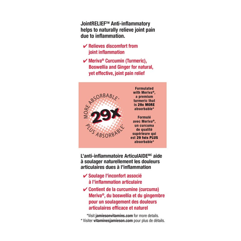 Jamieson JOINTRELIEF Anti-Inflammatory contains the active and patented ingredient Meriva. Made from specially enhanced curcumin, it helps reduce the body's inflammatory response to stress and injury and is a natural alternative to non-steroidal anti-inflammatory drugs (NSAIDs). JOINTRELIEF Anti-Inflammatory also contains traditional herbal ingredients boswellia (frankincense) and ginger, which are well known to target inflammation.