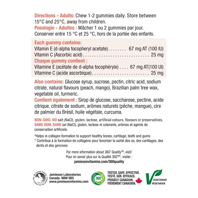 Jamieson Vitamin E Gummies Peach Mango Flavour 70 Count, Natural Antioxidant & Collagen Formation Support