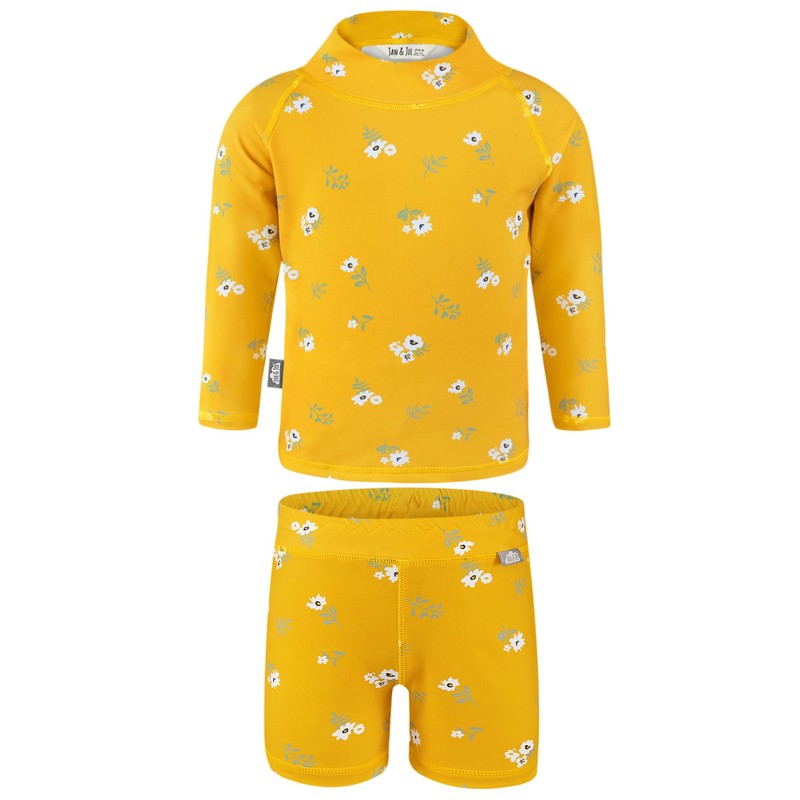 JAN & JUL Girls' Swim Set, Rash Guard and Trunks with Sun Protection for Kids (Yellow Flower, Size 6Y)