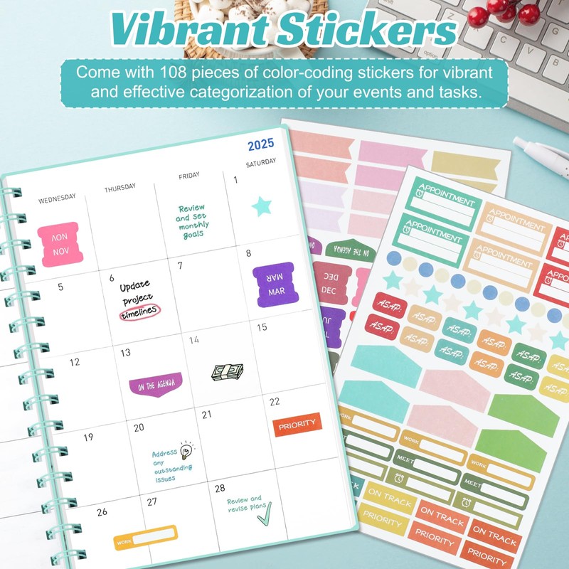 - Planner notebook JAN2025-JUN2026: An 18-month calendar monthly planner is included. With 108 colour coding stickers for a vibrant and effective categorisation of your events and tasks. With 100 double-sided sheets and a total of 200 pages, this bound to-do list diary offers enough space for all your notes, reminders and detailed planning requirements.