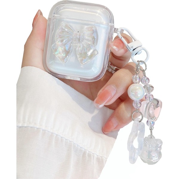 JANDM for AirPods Case Cover with Keychain,Shockproof Soft Clear Cute 3D Crysta Bowknot Design Cover with Bling Heart Beads Keychain for AirPods 2nd/1st Generation