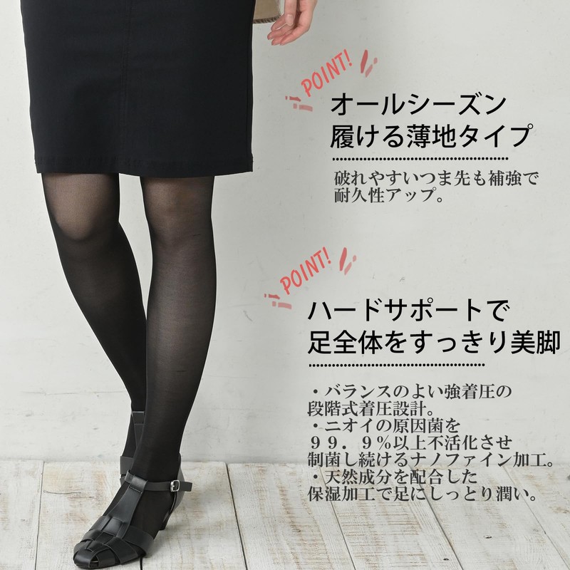 - High power compression stockings that make your legs look neat and beautiful all day. The pants have a three-dimensional weave to support your tummy and the graduated compression design provides a balanced and strong compression. In addition, it has been treated with nanofine processing, which inactivates and prevents bacteria that causes odors. Moisturizes and moisturizes your feet