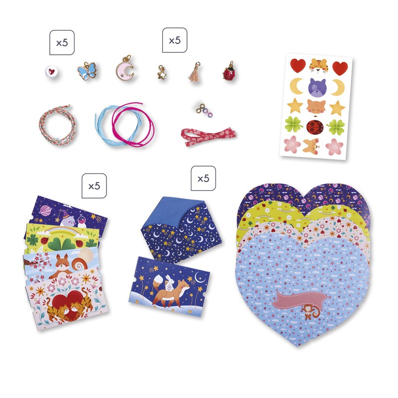 - Complete set: 1 printed ribbon, 1 braided thread, 2 pink + blue jade threads, 4 pendants (butterfly, star, moon, ladybird), 1 pompom, 2 mother-of-pearl beads, 2 golden beads, 1 printed bead, 5 cards, 5 envelopes, 1 sheet of stickers, 1 instruction book.