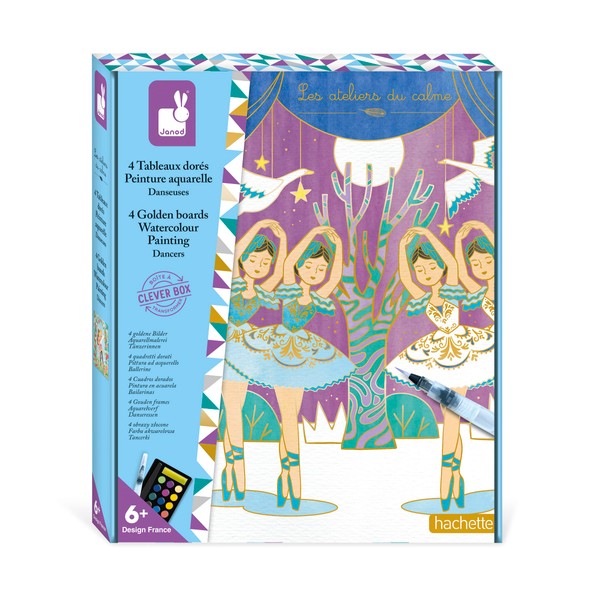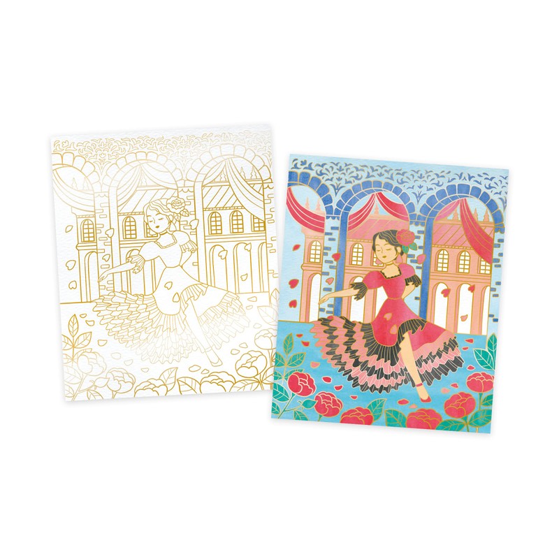 - An original activity: this creative set consists of 4 beautiful paintings depicting dancers (ballet, flamenco, etc.) that your child must colour thanks to the 15 watercolour colours and the brush with a water tank.