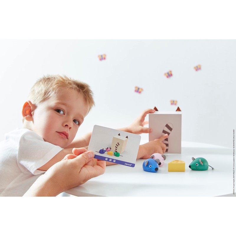 - CONTAINS: This Janod game in FSC wood and cardboard comprises 1 cat, 1 table, 3 mice (pink, green and blue), 1 wedge of cheese, 12 double-sided model cards and 1 instruction guide. Size: 10 x 10 x 14 cm.
