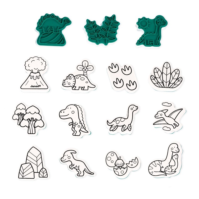 Janod - Stampinoo Dinosaur Set - 15 Ink Pads and 1 Ink Bottle for Small Hands - Creative Children's Hobbies - Fine Motor Skills and Creativity - From 3 Years J07721