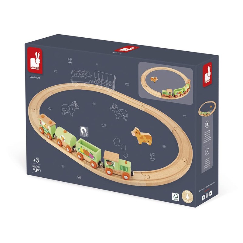 Janod - Story Farm Train - Wooden Circuit & Train - Cow Figurine Included - Early-Learning Toy - Fine Motor Skills - Water-Based Paints - 3 Years + J04630