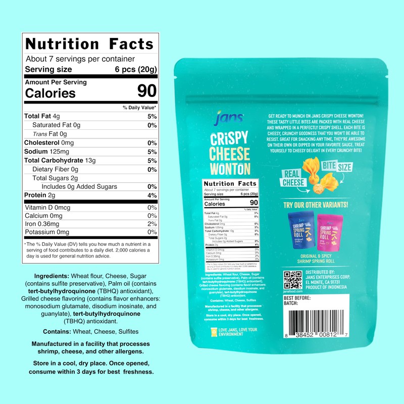 Discover the irresistible crunch of Jans Crispy Cheese Wonton! These bite-sized delights pack real cheese filling inside a perfectly crispy wonton shell, creating a satisfying snack experience in every piece. Each 5.29 oz package contains 7 servings, with 6 pieces per serving, making them perfect for sharing or snacking throughout the week. At just 90 calories per serving, these tasty morsels offer a delightful balance of flavors and textures. They're versatile enough to enjoy on their own or paired with your favorite dipping sauce. The convenient resealable package helps maintain freshness, though best enjoyed within 3 days of opening when stored in a cool, dry place. For those who love variety, Jans also offers other exciting variants including shrimp spring roll flavors. Made in Indonesia and distributed from El Monte, CA, these wontons bring a unique twist to your snack selection.