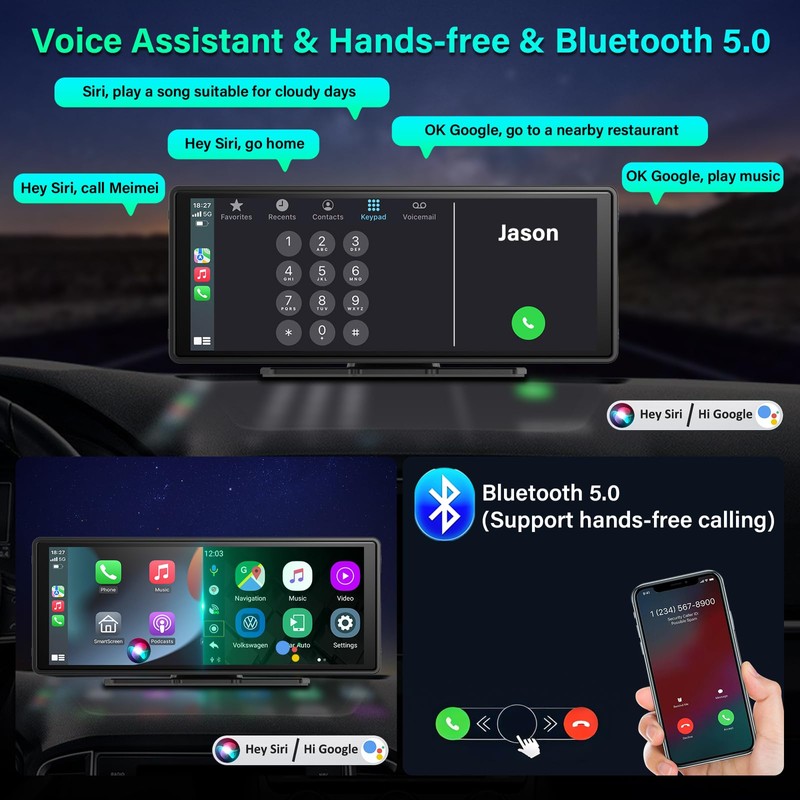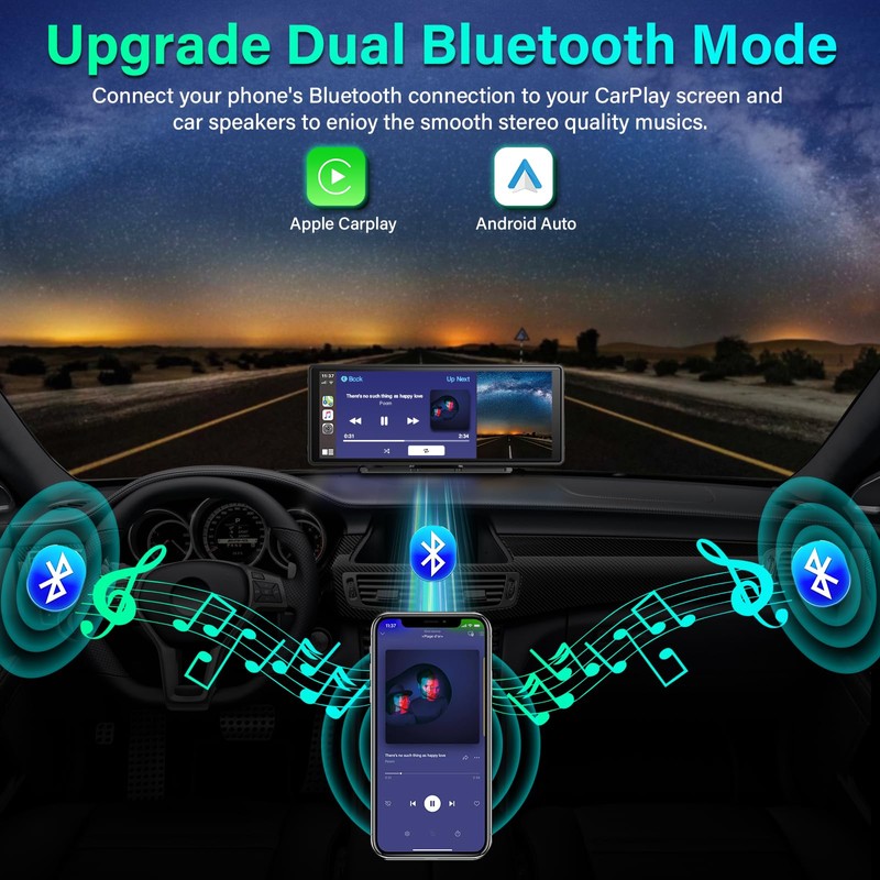 - Dual Bluetooth, 4 Audio Output Modes:The carplay screen for car with the Dual Bluetooth technology, you can enjoy map navigation and your favourite music at the same time while driving. You can connect to android auto screen via Bluetooth 5.0 to stream audio to your car's audio speakers for a lossless car audio experience. You can also use an AUX cable/FM transmitter to transmit sound to your car's speakers. The wireless carplay with its own speaker that emit sound through the device itself