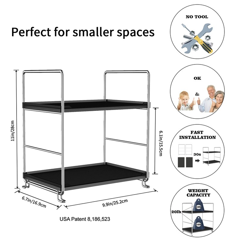 In our daily life, things are always out of order or you do not have enough space to store. JANUS LIANG 2-Tier storage rack provides extra shelving and space utilization solution, helps de-cluttering space, and keeps things organized. Make your home more tidy and orderly, more hygienic, and make your health more guaranteed.
