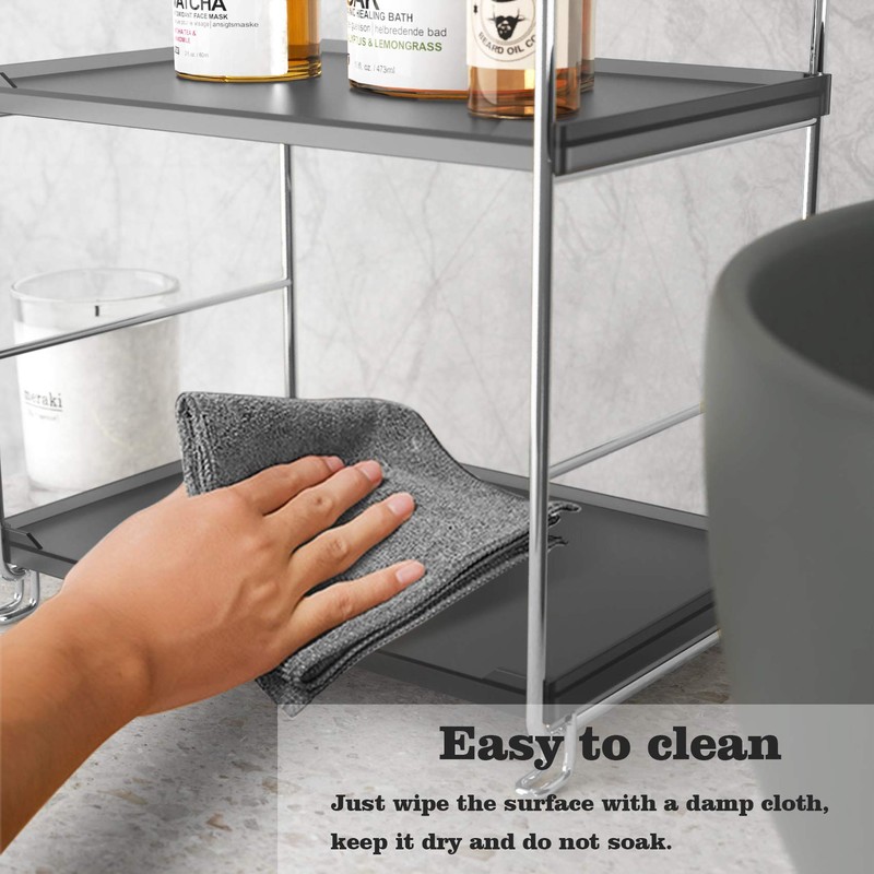 - 【COMPACT SHELF ORGANIZER】- Light luxury metal sense and compact design, 2-Tier the storage area. Stackable storage can efficiently use space and bring a tidy desktop. Organize all of your bathroom essentials; Perfect for makeup, hair spray, lotion and other cosmetics. They are always ready for you.