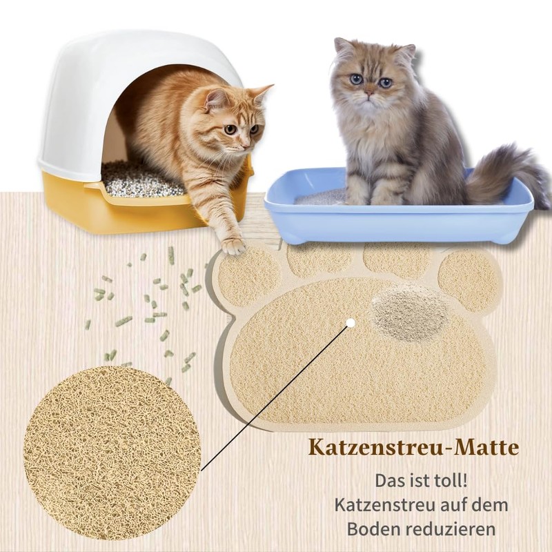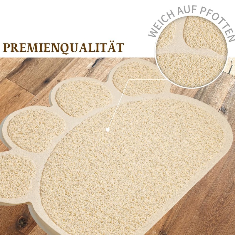 - Features: This mat is durable, water-repellent, soft for paws and easy to clean. The non-slip backing keeps the mat in place and ensures that no litter escapes to the floor. The cute design fits perfectly into the cat's living area.