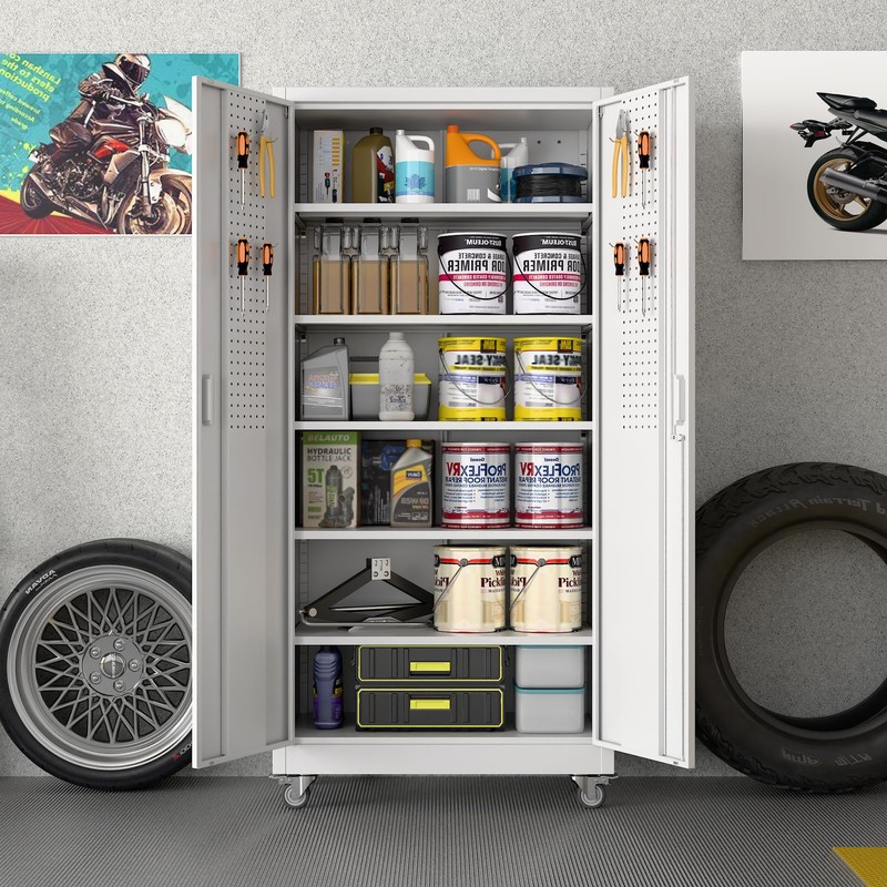- Adjustable Shelves and Multi-functional Pegboard-garage storage cabinet have a total of 5 adjustable shelves. The height can be adjusted according to different scene requirements, which is convenient and flexible. Moreover, the sides of storage cabinet have been upgraded with multi-functional perforated boards, which can be used to hang items and make efficient and reasonable use of the space.
