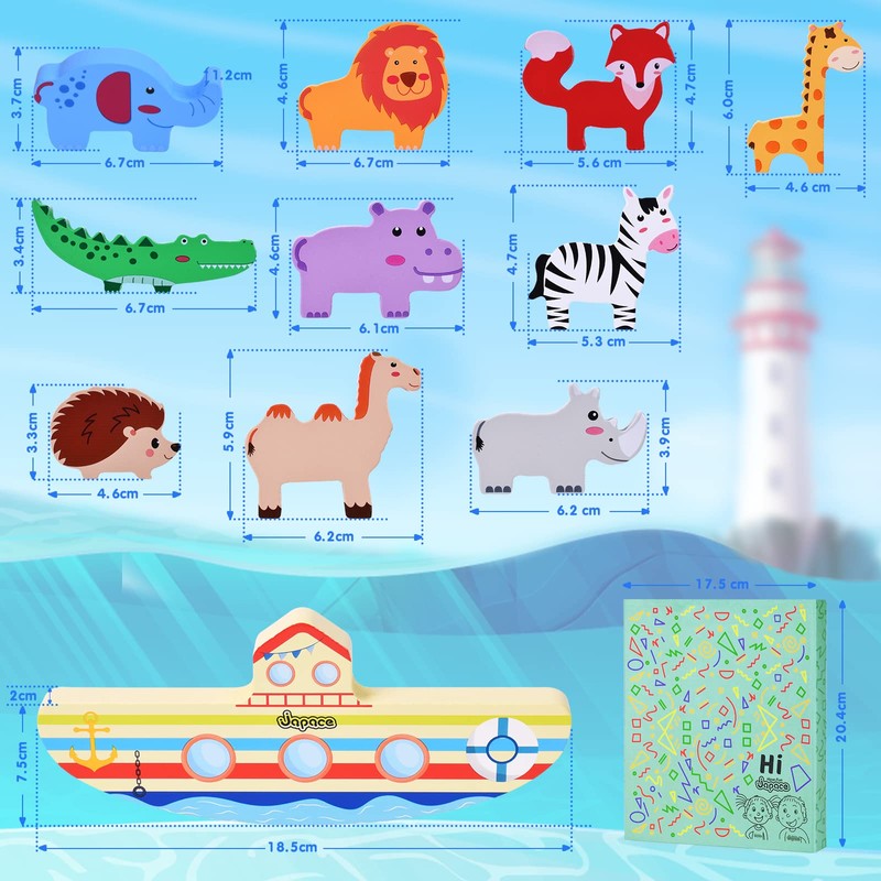 - Noah's Ark stacking game: This Noah's Ark stacking game contains 1 ark and 10 shapes of cute animals (giraffe, crocodile, zebra, fox, hedgehog, etc.) play and brings children endless imagination.