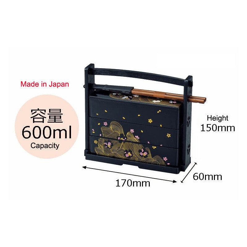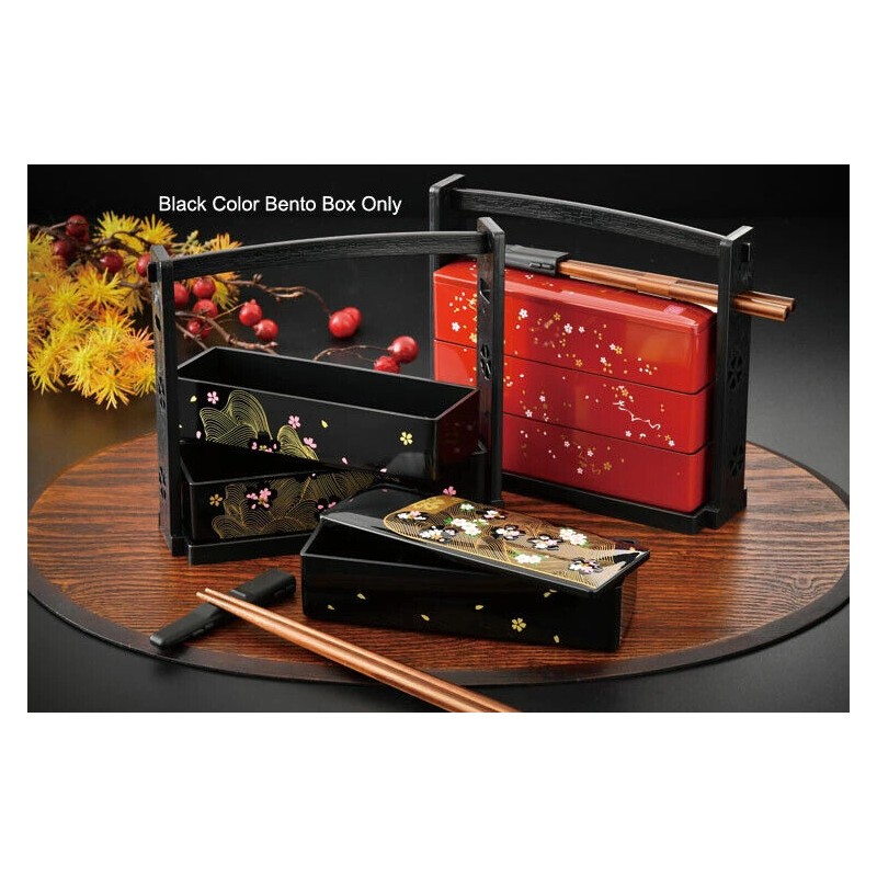 JapanBargain Japanese Sakura Lunch Bento Box w/Chopsticks Three Tiers Black S-1951