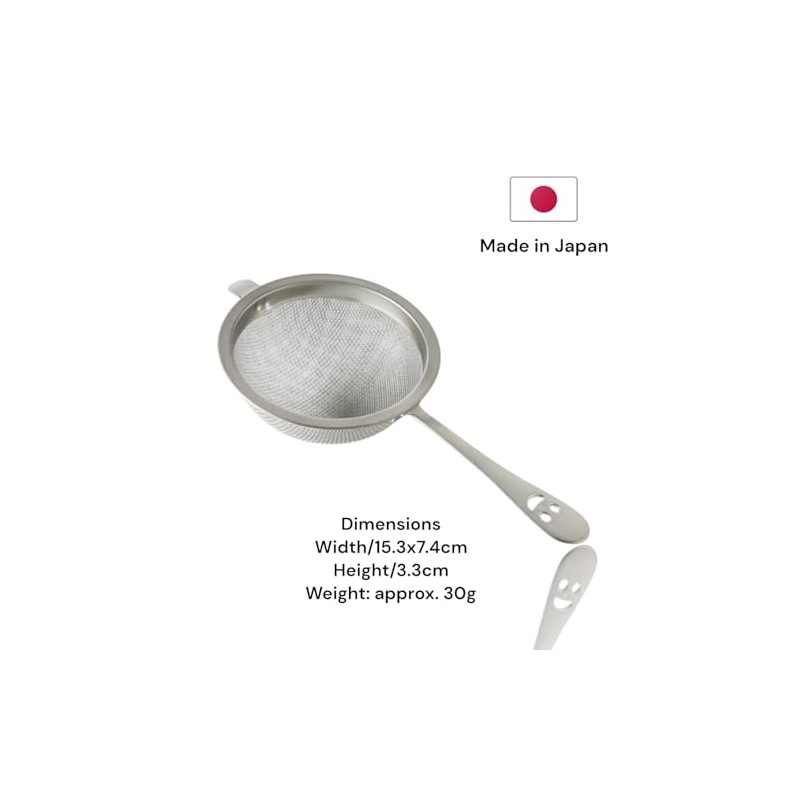 Elevate your tea preparation with this premium Japanese-made tea strainer, crafted from high-quality stainless steel. The fine mesh design is perfect for sifting matcha powder and straining loose leaf teas, ensuring a smooth, clump-free experience. The thoughtfully designed 6-inch long textured handle provides a secure grip and keeps your hands away from hot liquids. With its precise dimensions of 3 inches in width and 1.3 inches in height, this lightweight sieve weighs just about 1 ounce, making it easy to maneuver. The durable stainless steel construction resists corrosion and maintains its pristine appearance with proper care. Whether you're a matcha enthusiast or a loose leaf tea connoisseur, this versatile strainer is an essential addition to your tea preparation toolkit. The fine mesh catches even the smallest particles while allowing liquids to flow through smoothly, resulting in the perfect cup every time.