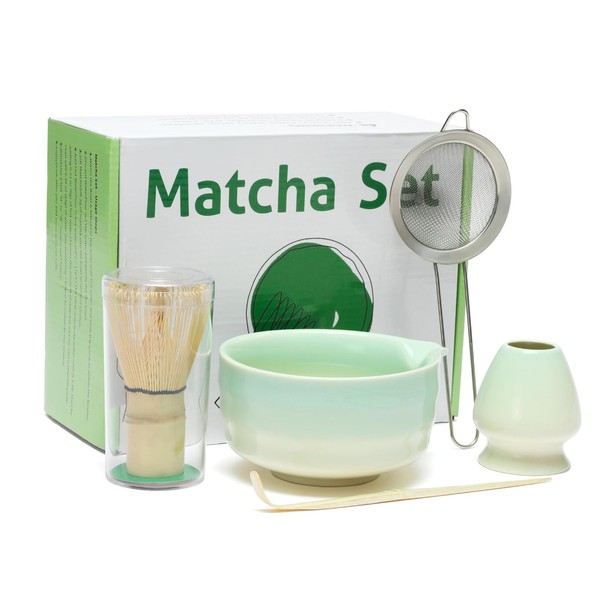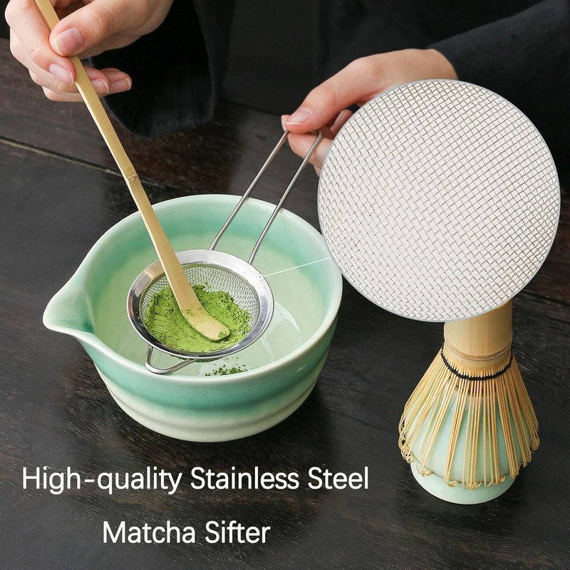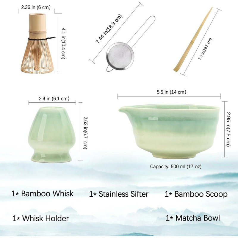 - Complete Matcha Kit: Our 5 Pcs matcha kit includes essentials for an authentic matcha experience: 1* Bamboo Matcha Whisk, 1* Bamboo Scoop, 1* Stainless steel sifter, 1* 500 ml/17 oz Ceramic Matcha Bowl (Chawan), and 1* Whisk Holder. Each tool is crafted with precision, designed to make your matcha lifestyle effortlessly stylish. Elevate your tea ritual with our thoughtfully curated collection, perfect for both enthusiasts and newcomers to the world of matcha.