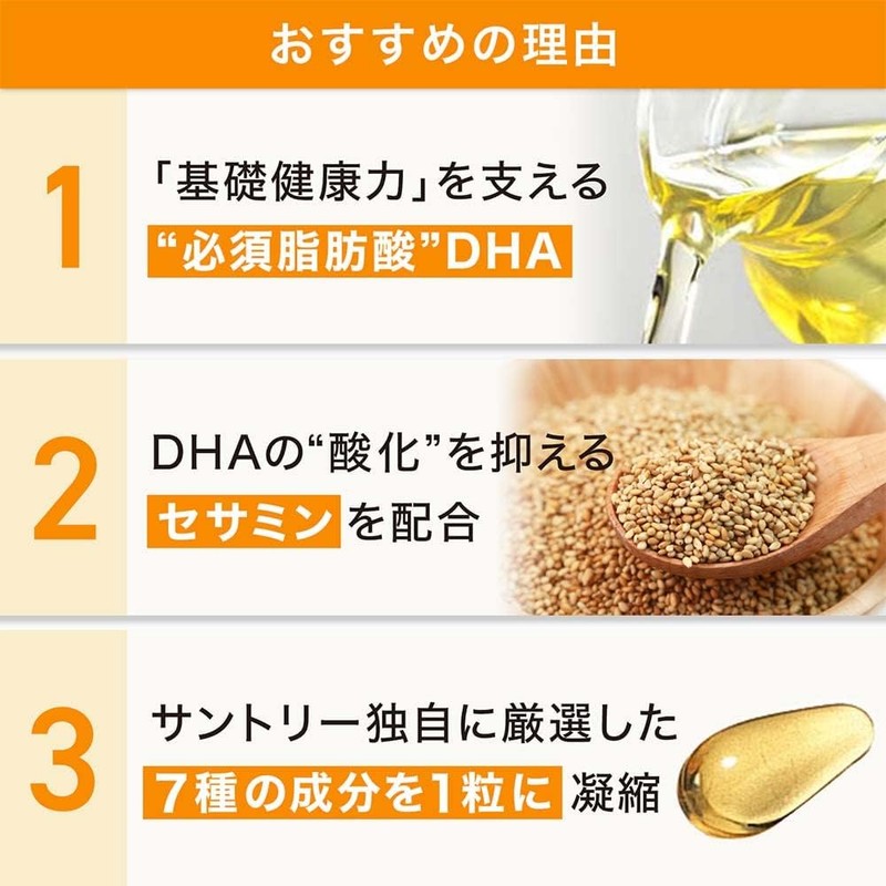 [Feature 2] Suntory's unique carefully selected 7 ingredients with this single bottle.Suntory DHA sesamine is a luxurious supplement made by tightly condensing seven carefully selected ingredients into one grain to build basic health. Suntory is particular about the quality and concentration of ingredients, especially fish oil, which is a raw material for DHA, has the highest concentration ever in Suntory, which has increased the concentration of DHA by about 20%. With this one, you can start building basic health skills.魚DHA concentration in fish oil