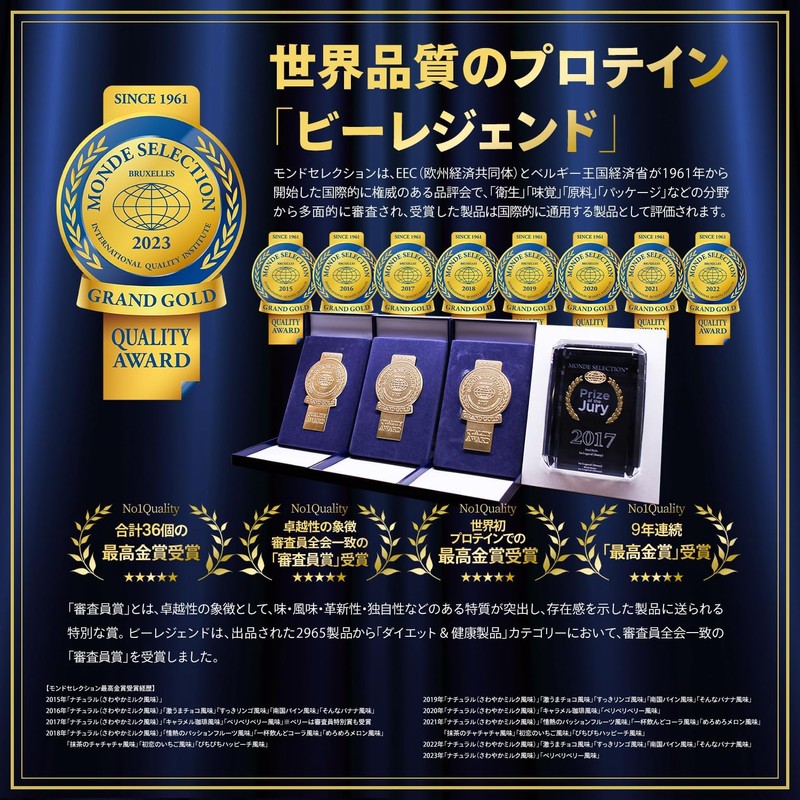 [High quality recognized by the world] Received the Monde Selection Highest Gold Award for 13 flavors. Natural refreshing milk flavor has won the highest gold award for 8 consecutive years. As a result of our continued pursuit of delicious taste using high-quality whey protein, we received the ITI (formerly iTQi) Excellent Taste Award for five consecutive years, which is proof of excellent taste.