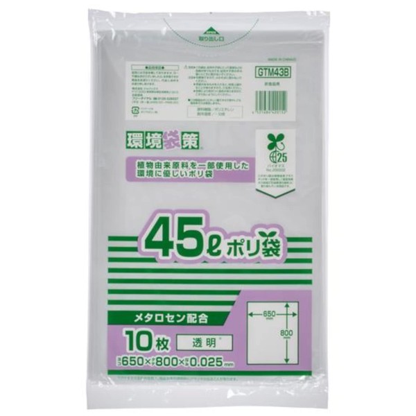Japax GTM43B Trash Bags, Transparent, Height 31.5 x Width 25.6 x Thickness 0.01 inches (80 x 65 x 0.025 mm), 10 Pieces, MAX Metallocene Blend, 25% Biomass, Polybag