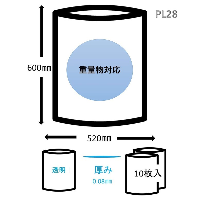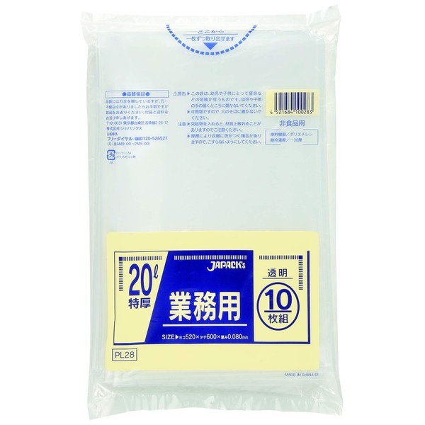 Japax PL28 Trash Bags, Transparent, Width 20.5 x Height 23.6 x Thickness 0.03 inches (52 x 60 x 0.08 mm), 5.3 gal (20 L), 10 Pieces, Compatible with Heavy Objects, Commercial Use, Extra Thick Plastic Bags