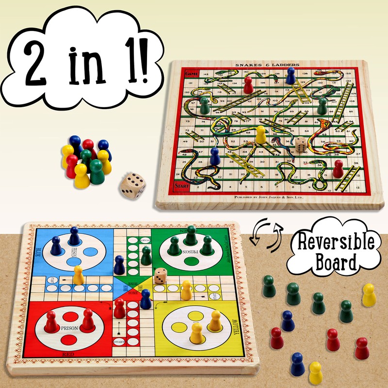 - 2 IN 1 SNAKES AND LADDERS BOARD GAME | Combine 2 Jaques original game creations with our reversible wooden board game of 2 in 1 ludo and snakes and ladders.