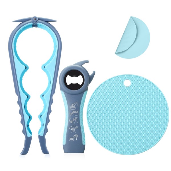 Jar Bottle Opener for Weak Hands,4 &5 in 1 Multi Function Non-Slip Can Lid Opener Tools with Silicone Jar Gripper Pad,Suitable for Seniors,Children and Arthritic Hands (Light Blue)