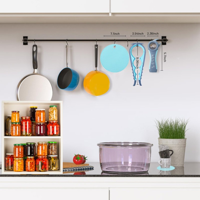 - 【4 in 1 Jar Opener】8 sizes of round openings make the can opener very convenient for opening small and medium lids (1-3inch),including bean jars,pickle jar lids,jams and more. The bottle opener is made of strong high temperature resistant PP plastic,not easy to damage and break,The new thermoplastic rubber on the surface of the Jar Opener,both firmly holds the jar lid and makes it less slippery,allowing you to easily open the jar lid without too much effort