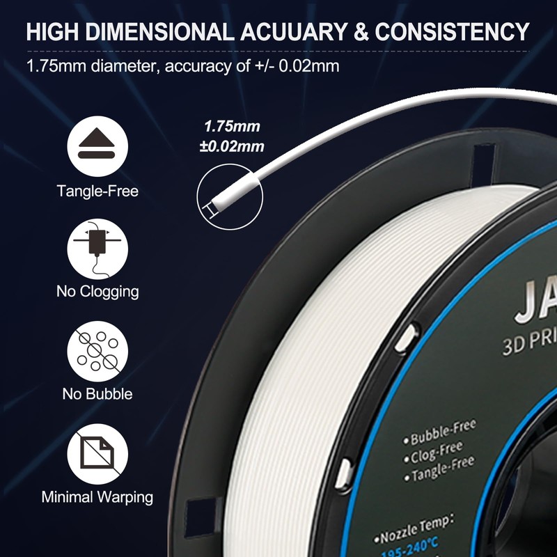 - 【Recommend Settings&All Lifetime Warranty】We recommend printing the PLA filament at nozzle temperature of 200-230°C, bed temperature of 50-65°C, and printing speed of 50-300mm/s. Discover worry-free 3D printing with JAREES filament—backed by our lifetime satisfaction guarantee.