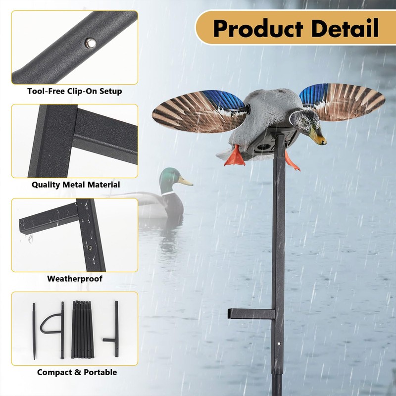 - Simulate Real Scenes: The spinning wing decoy pole is detachable and can simulate the height and angle of the pole by adjusting it during use. The different postures and positions of mallards in natural environments, such as foraging in the water, resting, or standing on the shore, make the decoy more realistic, making it easier for ducks to feel close and be attracted