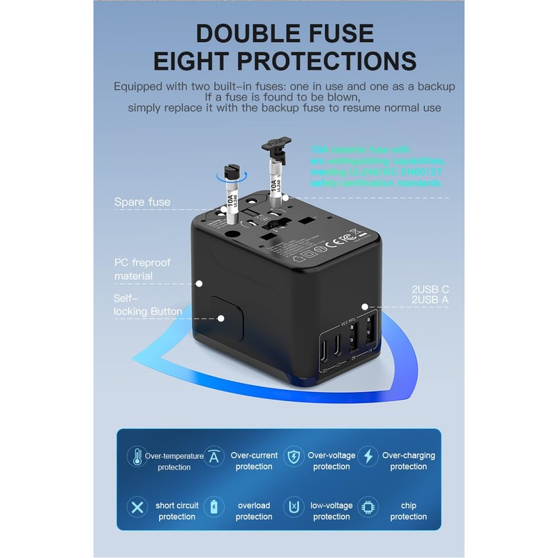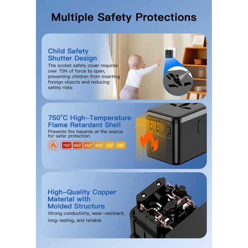 - 🛡️ Advanced Safety Protection Certified by FCC, CE, EMC, LVD, RoHS, and UKCA, this adapter features dual 10A fuses for built-in surge, overload, and short-circuit protection, ensuring safety for you and your devices. Also features a Child Safety Shutter and has a Flame-Retardant Casing Rated to 750°C.