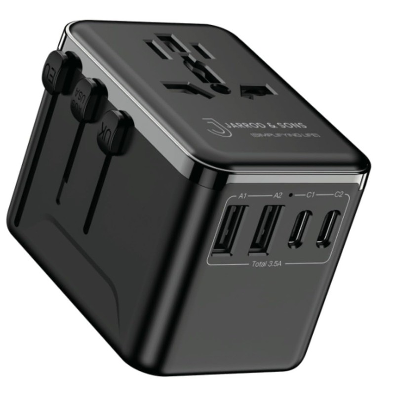 Jarrod & Sons Universal Travel Adapter – 4-Port USB Hub & Wall Charger (2A2C, 17.5W) with EU/US/UK/AUS Plugs – Desktop Charging Station for Travel & Home Use