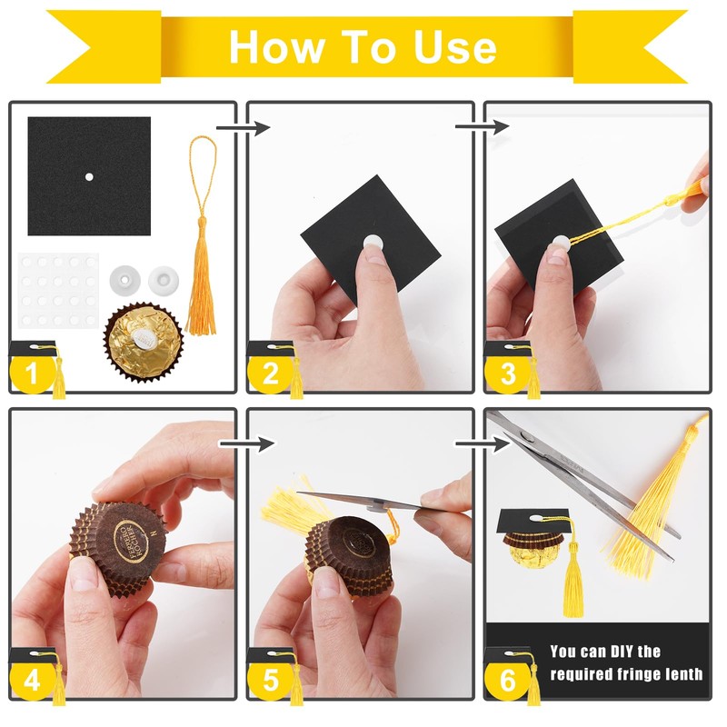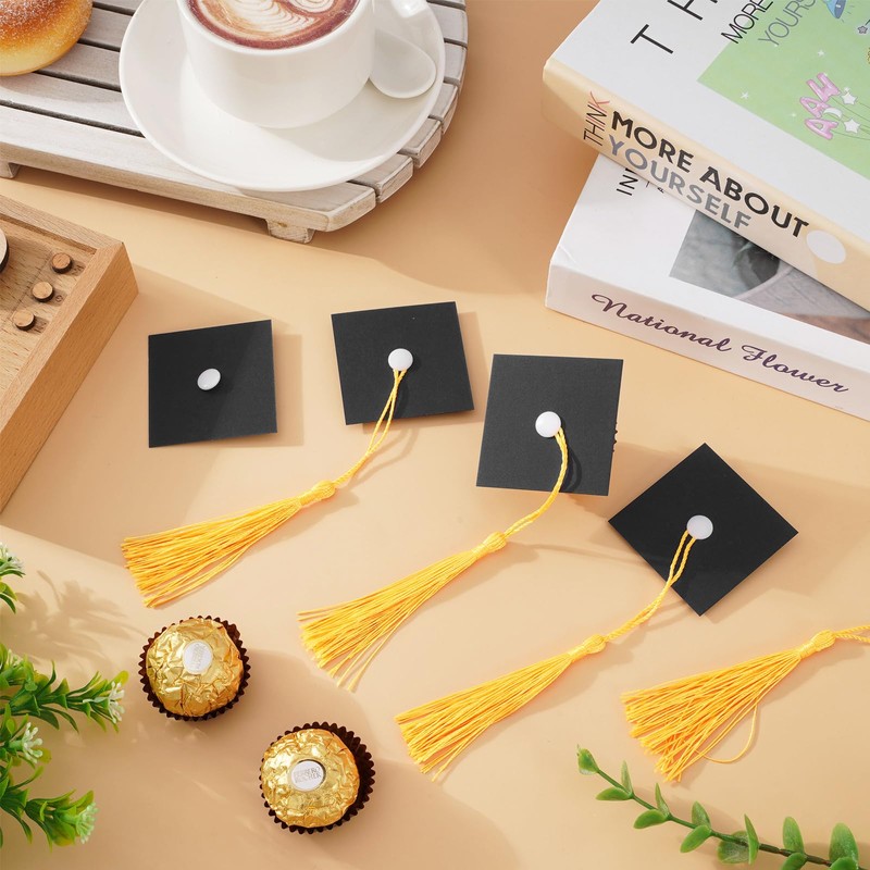 • PACKAGE INCLUDES: 120 packs mini graduation cap decorations, which contains of 120 sheets card stock paper, 120 pcs gold tassels, 120 pcs snap fasteners and 120 pcs glue points, sufficient to meet your various decoration needs