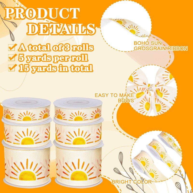 JarThenaAMCS 3 Roll Boho Sun Grosgrain Ribbon Summer Sunshine Print Fabric Ribbon for Back to School Classroom Birthday Wreath Bow Craft Gift Wrap Party Decor, 15 Yards