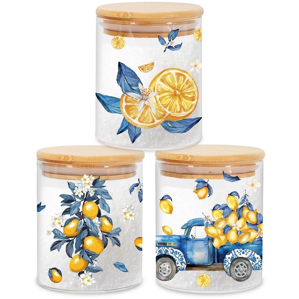 JarThenaAMCS 3Pcs Lemon Floral Glass Storage Jars with Airtight Lid Yellow Lemon Blue Leaves Tiles Decorative Canisters Sets for Spring Summer Farmhouse Home Kitchen Countertop
